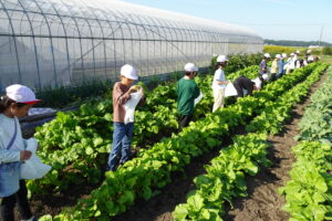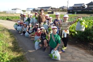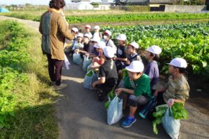 大阿坂の杉山さんの畑に行って、育ってきた赤菜を丁寧に間引きしました。子どもたちは上手に間引くことができ、あっという間に袋がいっぱいになりました。