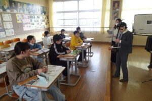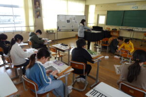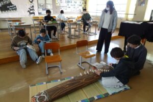 今日は、5限目の音楽の授業に竹上先生に来校いただき、お琴の演奏を聞かせていただいたり、実際にお琴に触れて音を出したりする機会を得ました。