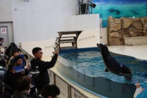 鳥羽水族館に着くと、まずはアシカショーを見ました。アシカショーでは、なんと児童が当てられて輪投げをすることができました。