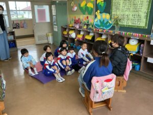 今日は朝から6年生が1年生に、本の読み聞かせをしてくれました。6年生が用意してくれたマットに座って、食い入るように絵本を見ながら聞いている様子が印象的でした。